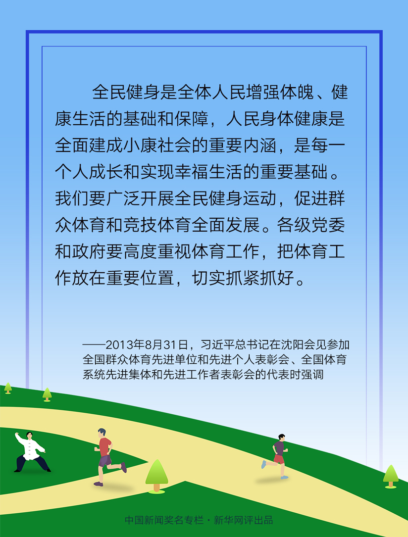 近些年來,人民群眾對生命質量和健康安全更加重視,健康需求呈現多樣化、差異化的特點。對此,既要著力構建起強大的公共衛生體系,努力做到全方位、全周期保障人民健康,也要在“去哪健身”“如何健身”等與全民健身息息相關的“小事”上做實做細。要更科學合理布局場地建設、讓更多社會資本參與場地建設、讓更多學校場地敞開大門,不斷增加適合百姓健身的體育場所;要通過打造15分鐘健身圈、推進公共體育設施免費或者低收費開放,進一步增加百姓身邊的健身設施;要不斷加強科學指導,讓科學健身的理念更加深入人心,減少不當健身帶來的傷病隱患;要從娃娃抓起,提高體育教育在學校教學的比重,讓孩子們學會一兩項體育技能,培養其終身科學鍛煉的好習慣,培育其健全人格。