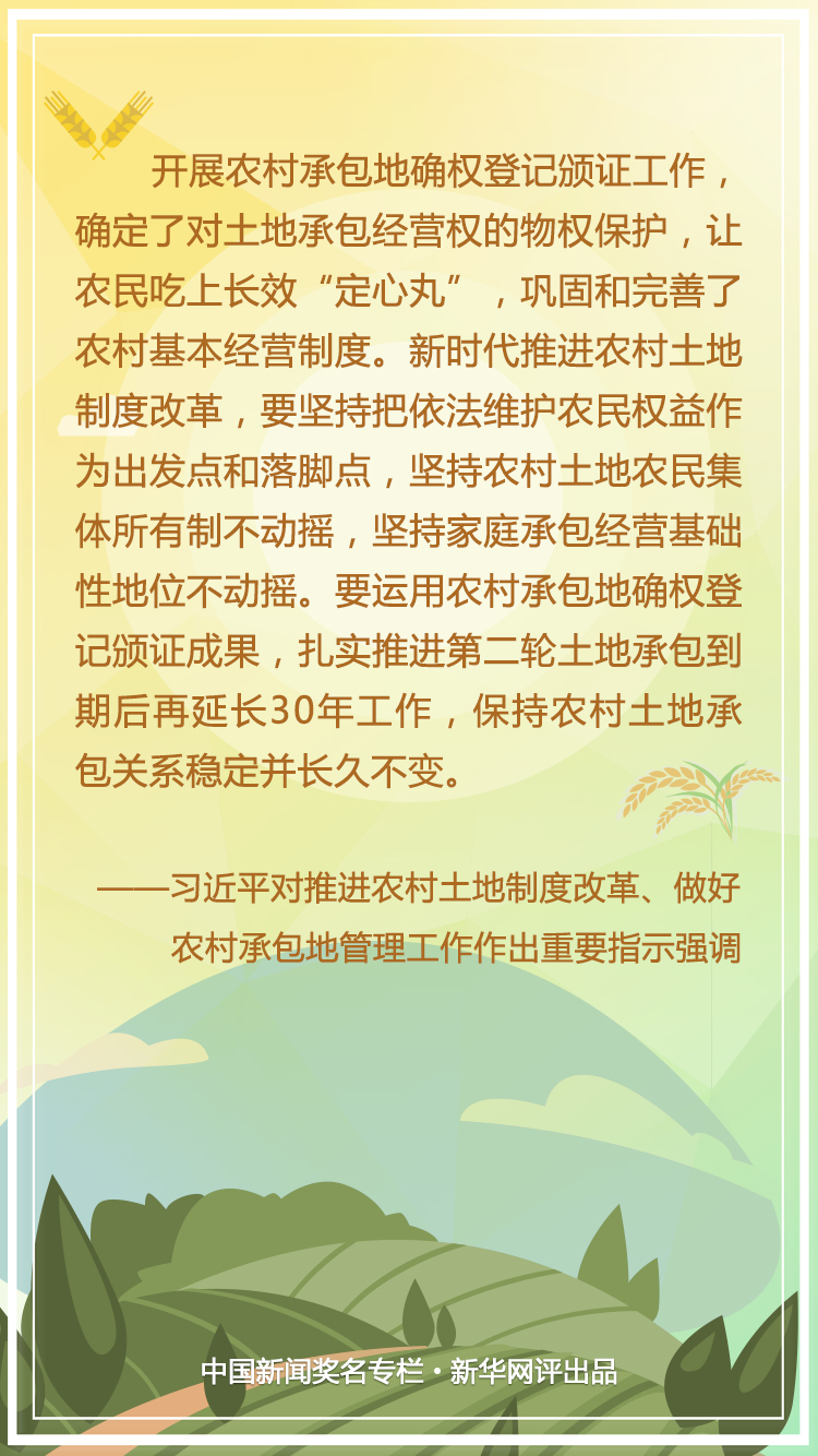 農,天下之大業也。新時代推進農村土地制度改革、做好農村承包地管理工作,進一步鞏固和完善農村基本經營制度,保障農民的土地承包權益,是安民固本之舉,意義重大,影響深遠。