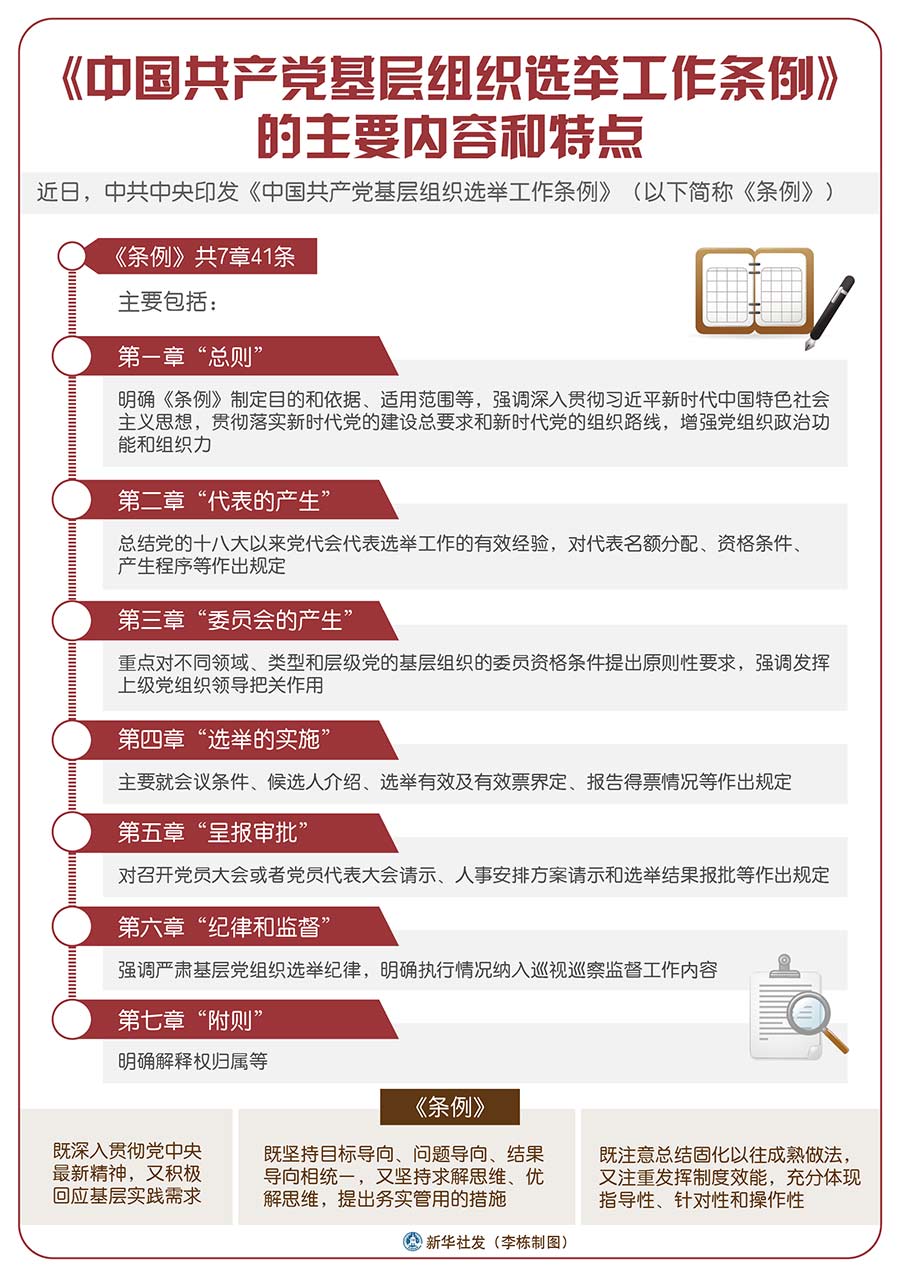 答:《條例》共7章41條,主要包括:第一章“總則”,明確《條例》制定目的和依據、適用范圍等,強調深入貫徹習近平新時代中國特色社會主義思想,貫徹落實新時代黨的建設總要求和新時代黨的組織路線,增強黨組織政治功能和組織力。第二章“代表的產生”,總結黨的十八大以來黨代會代表選舉工作的有效經驗,對代表名額分配、資格條件、產生程序等作出規定。第三章“委員會的產生”,重點對不同領域、類型和層級黨的基層組織的委員資格條件提出原則性要求,強調發揮上級黨組織領導把關作用。第四章“選舉的實施”,主要就會議條件、候選人介紹、選舉有效及有效票界定、報告得票情況等作出規定。第五章“呈報審批”,對召開黨員大會或者黨員代表大會請示、人事安排方案請示和選舉結果報批等作出規定。第六章“紀律和監督”,強調嚴肅基層黨組織選舉紀律,明確執行情況納入巡視巡察監督工作內容。第七章“附則”,明確解釋權歸屬等。