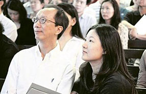 伏明霞梁錦松早早到校排隊(duì)給兒子報名