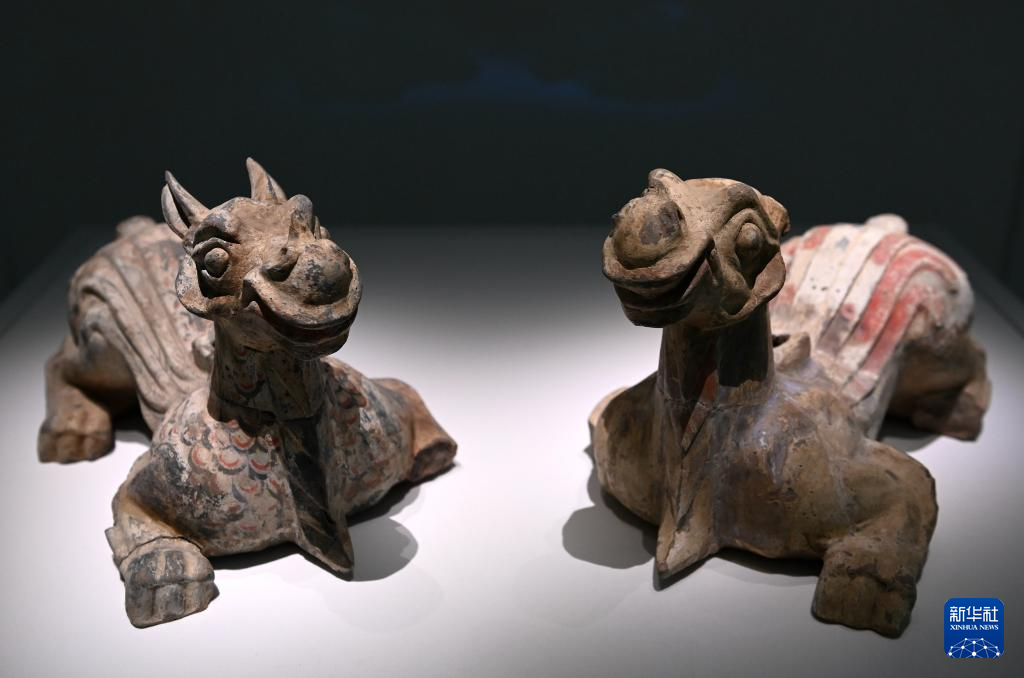 陕西历史博物馆秦汉馆内展出的西汉彩绘陶翼兽(5月13日摄)。