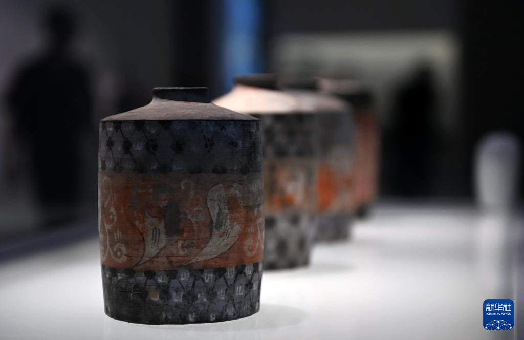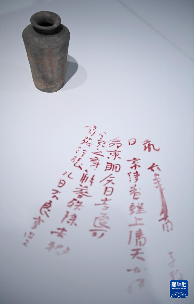 陕西历史博物馆秦汉馆内展出的东汉朱书陶罐(5月13日摄)。