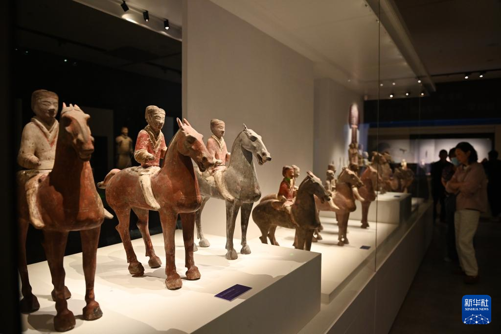5月6日,观众在陕西历史博物馆秦汉馆参观文物西汉彩绘陶俑。