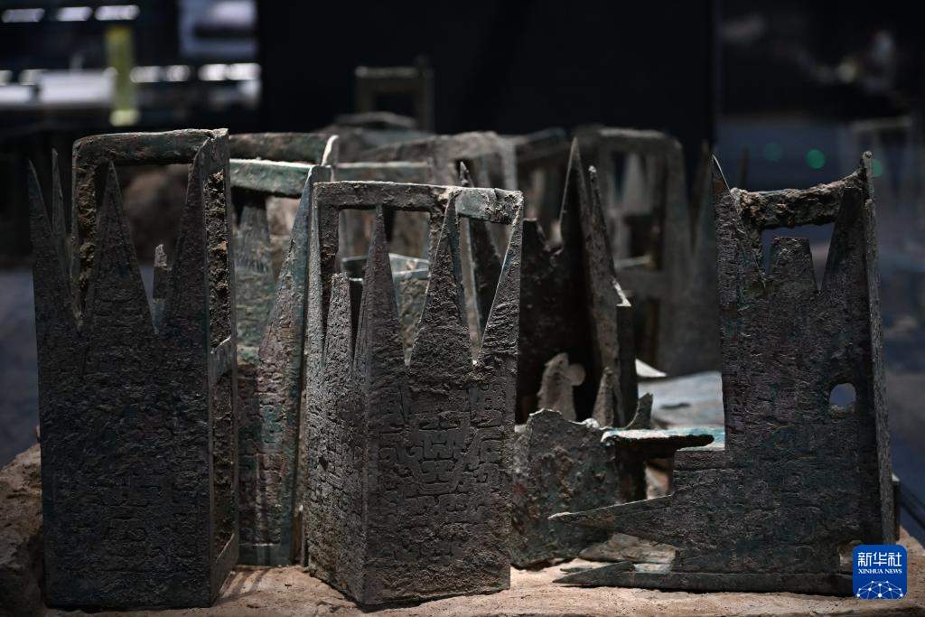 陕西历史博物馆秦汉馆内展出的春秋铜构件(5月13日摄)。