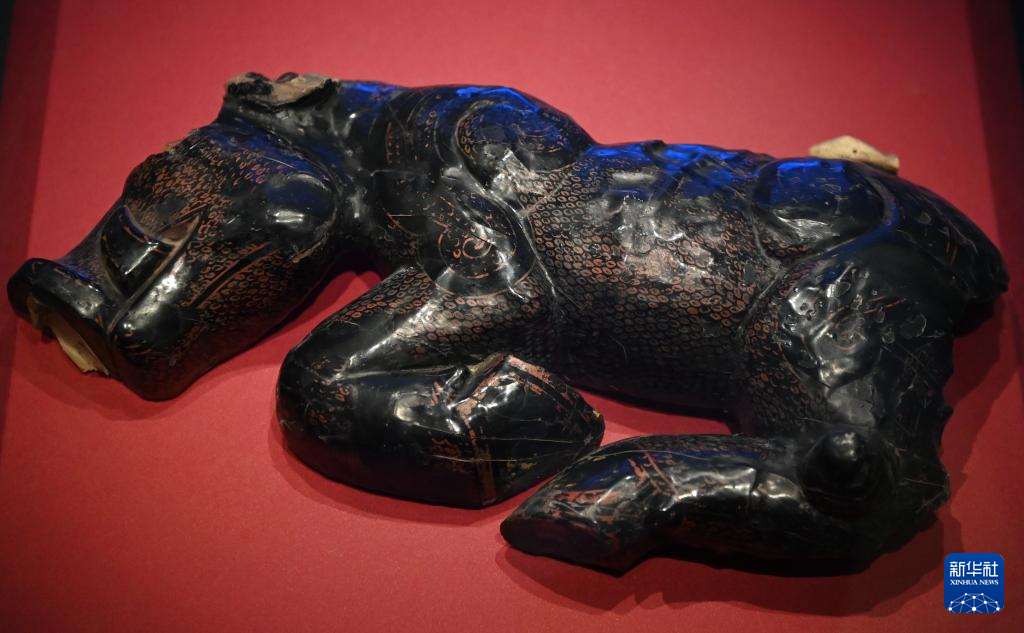 陕西历史博物馆秦汉馆内展出的春秋漆猪(5月6日摄)。