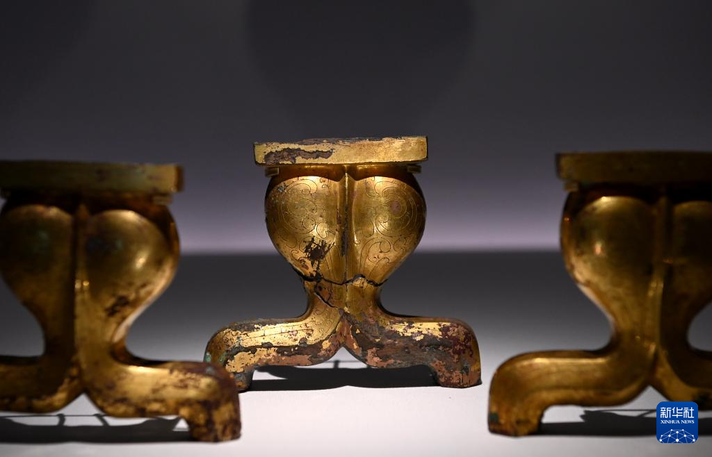 陕西历史博物馆秦汉馆内展出的西汉鎏金云纹铜案足(5月13日摄)。