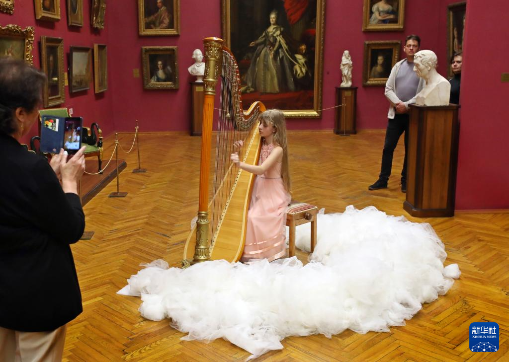 5月18日晚,演员在白俄罗斯国家美术馆内表演乐器。