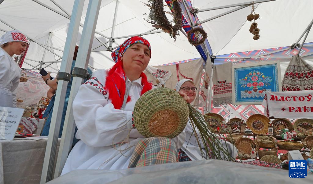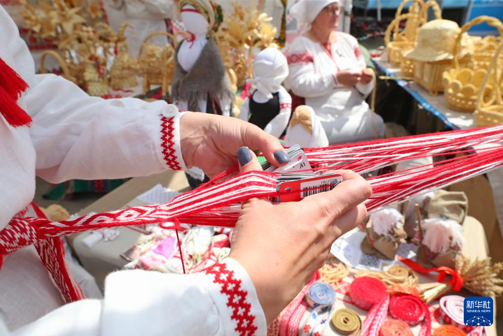 5月25日,手工艺者在白俄罗斯明斯克展示传统腰带制作。