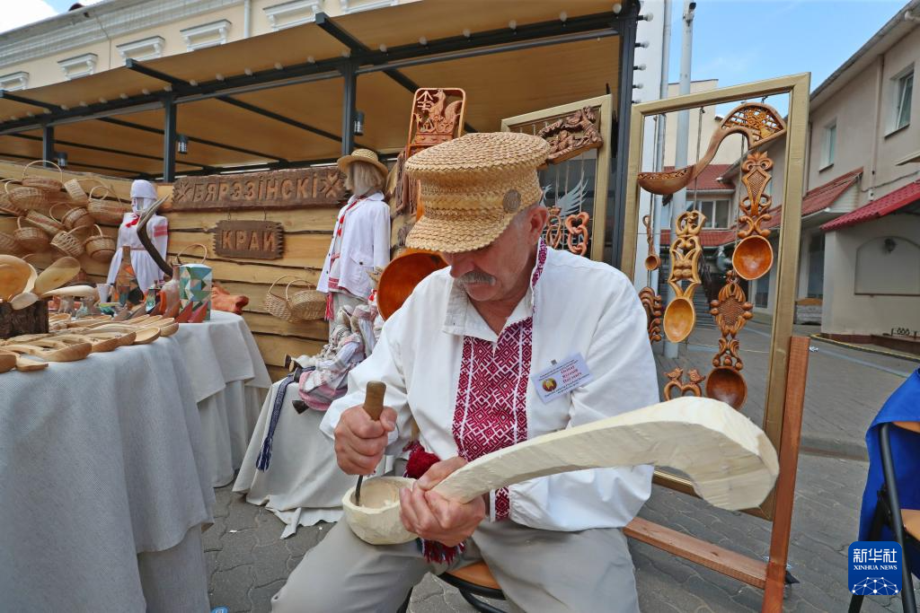 5月25日,手工艺者在白俄罗斯明斯克展示木器制作。