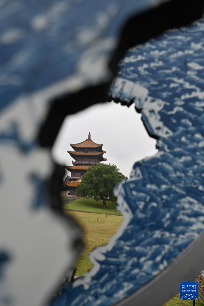 这是6月5日在江西景德镇透过创意青花瓷盘拍摄的龙珠阁。