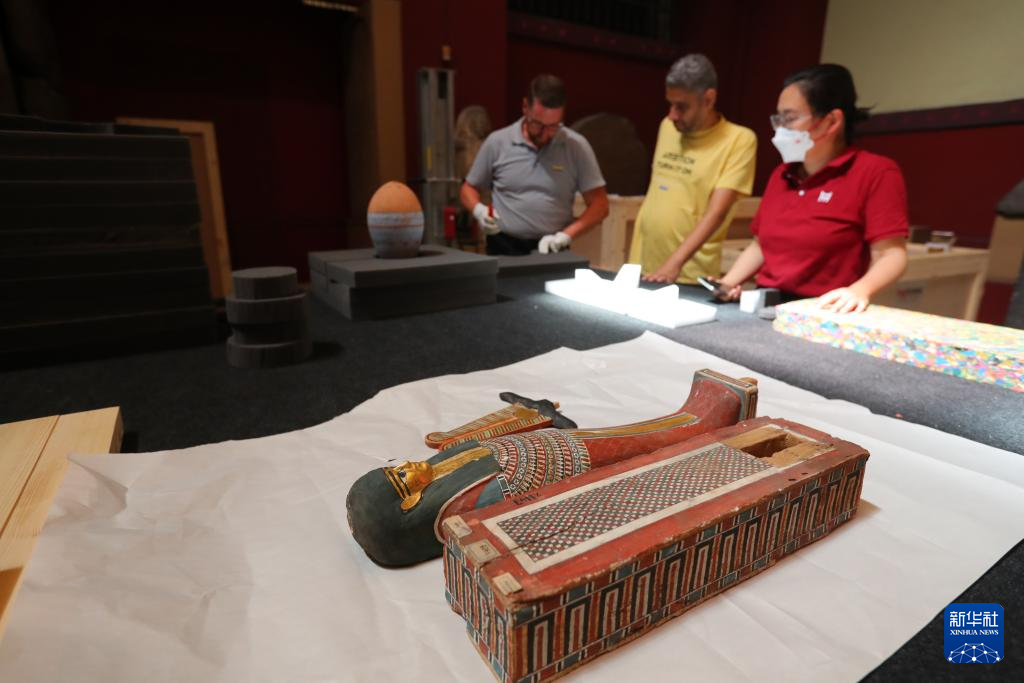 5月23日,在位于埃及首都开罗的埃及国家博物馆,上海博物馆的工作人员对一件木乃伊棺盖进行检查。