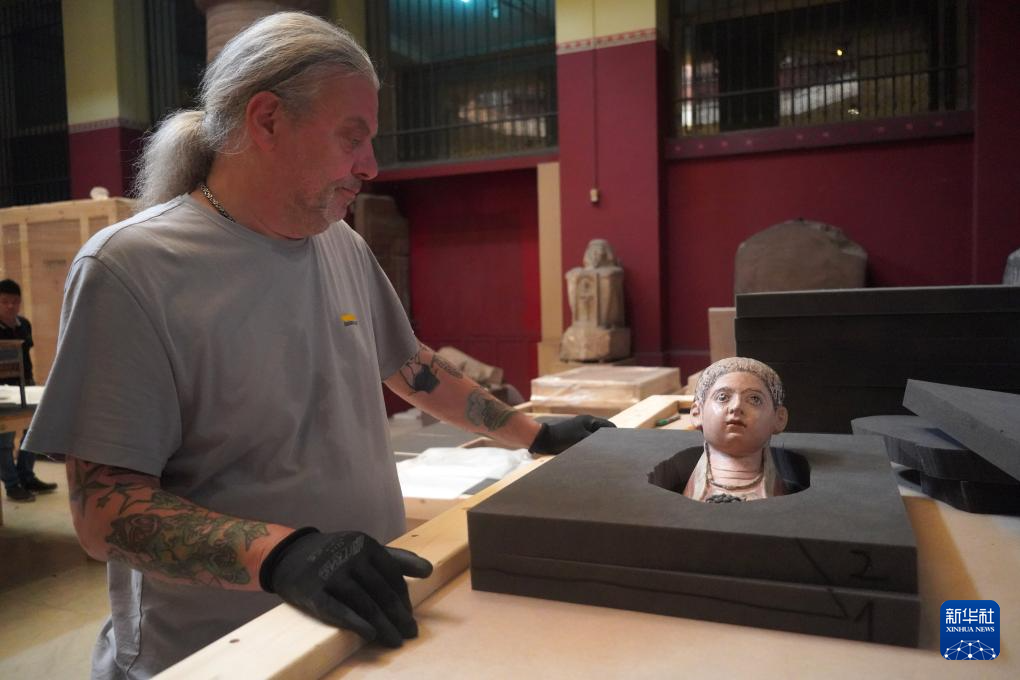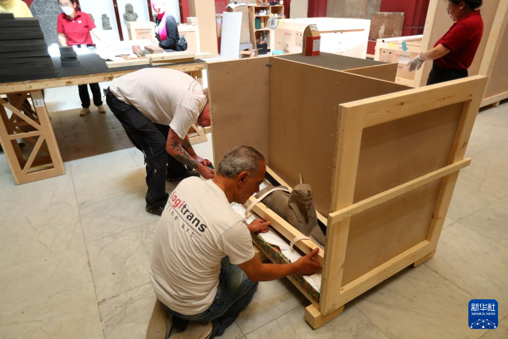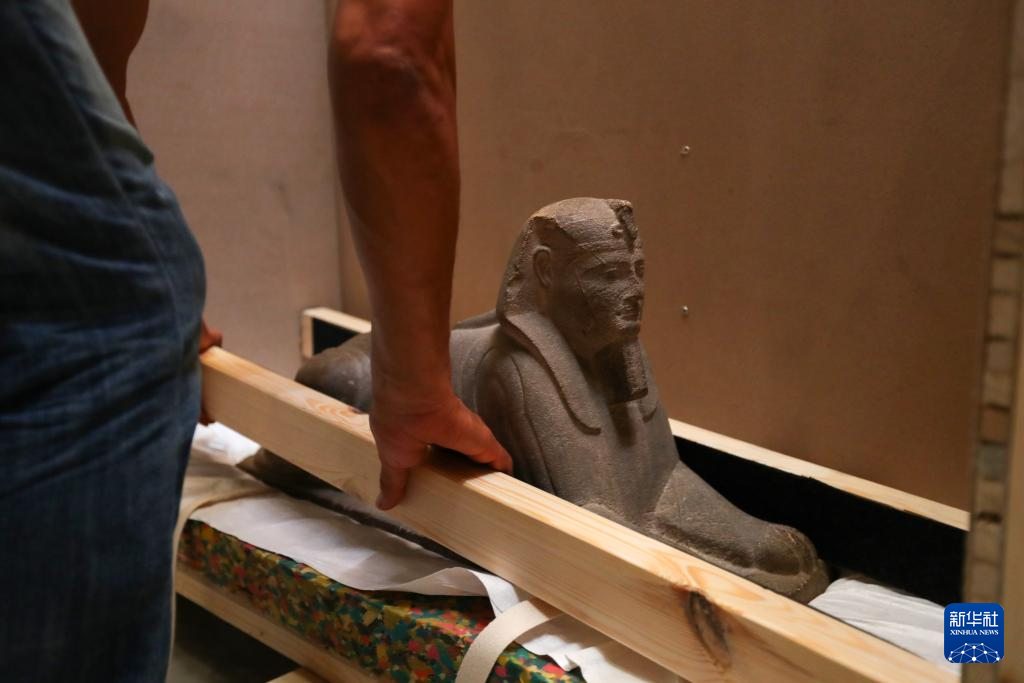 5月27日,在位于埃及首都开罗的埃及国家博物馆,工作人员对一件斯芬克斯小雕像进行打包。