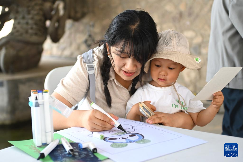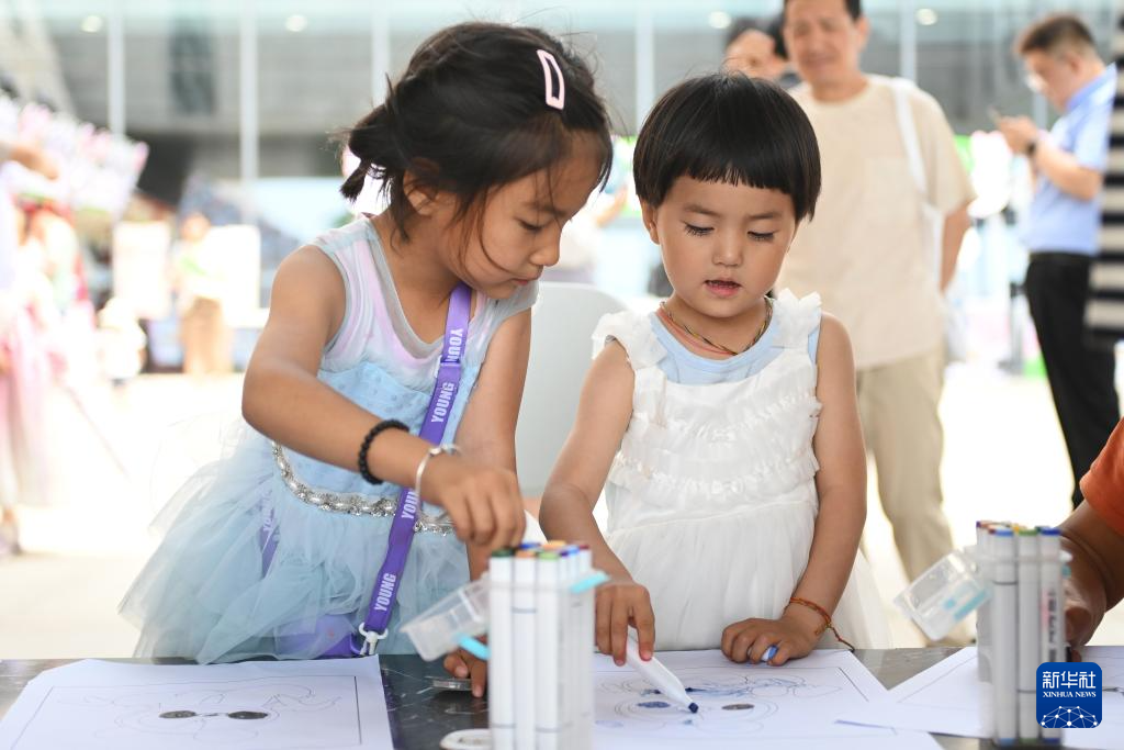 6月15日,在宁夏银川韩美林艺术馆,小朋友为大熊猫图案上色。