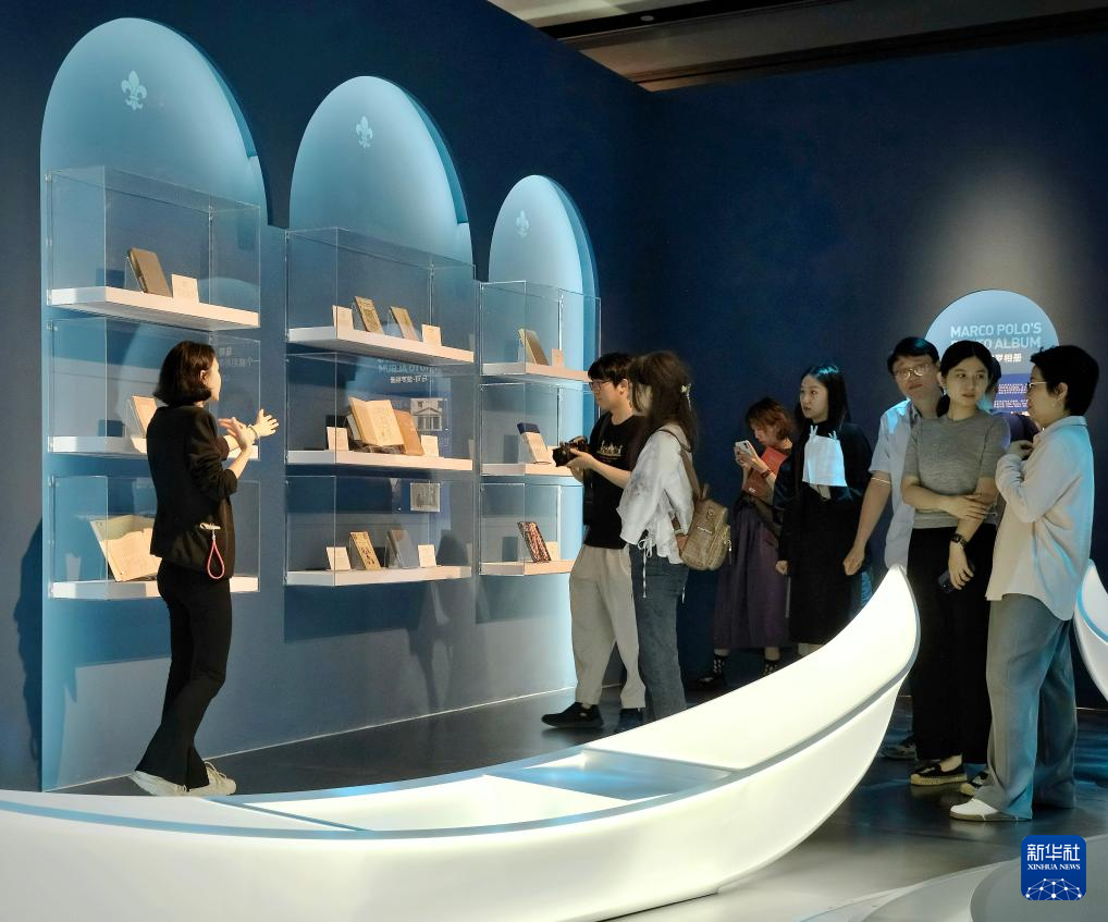 7月3日,工作人员(左)向参观者讲解一组马可·波罗相关文献资料的展品。