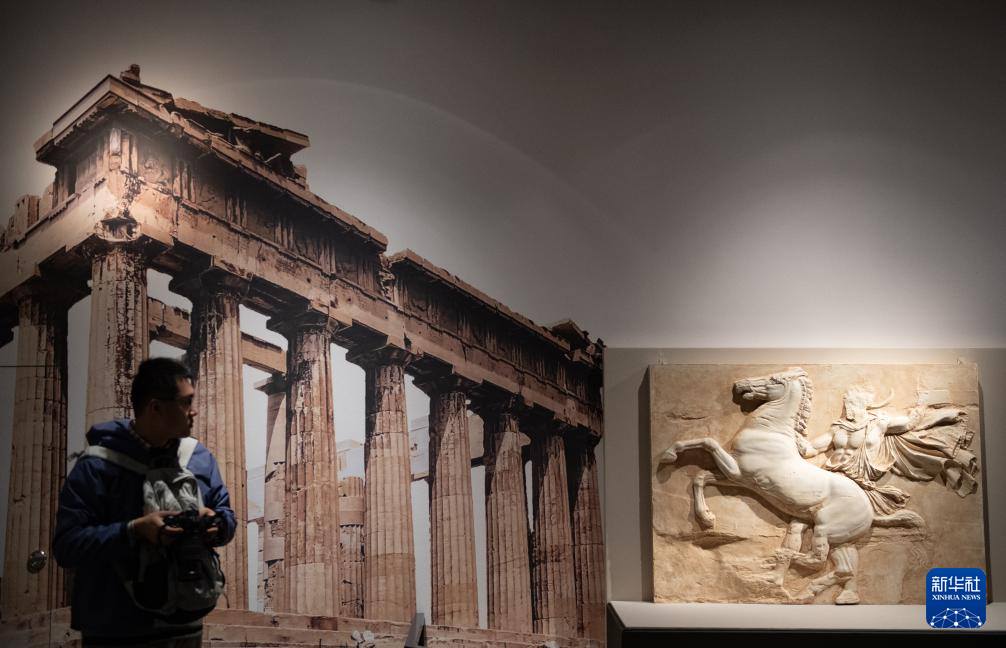 11月20日,一名参观者在观看来自希腊卫城博物馆的藏品帕台农神庙西侧的八号浮雕带(石膏复制品)。