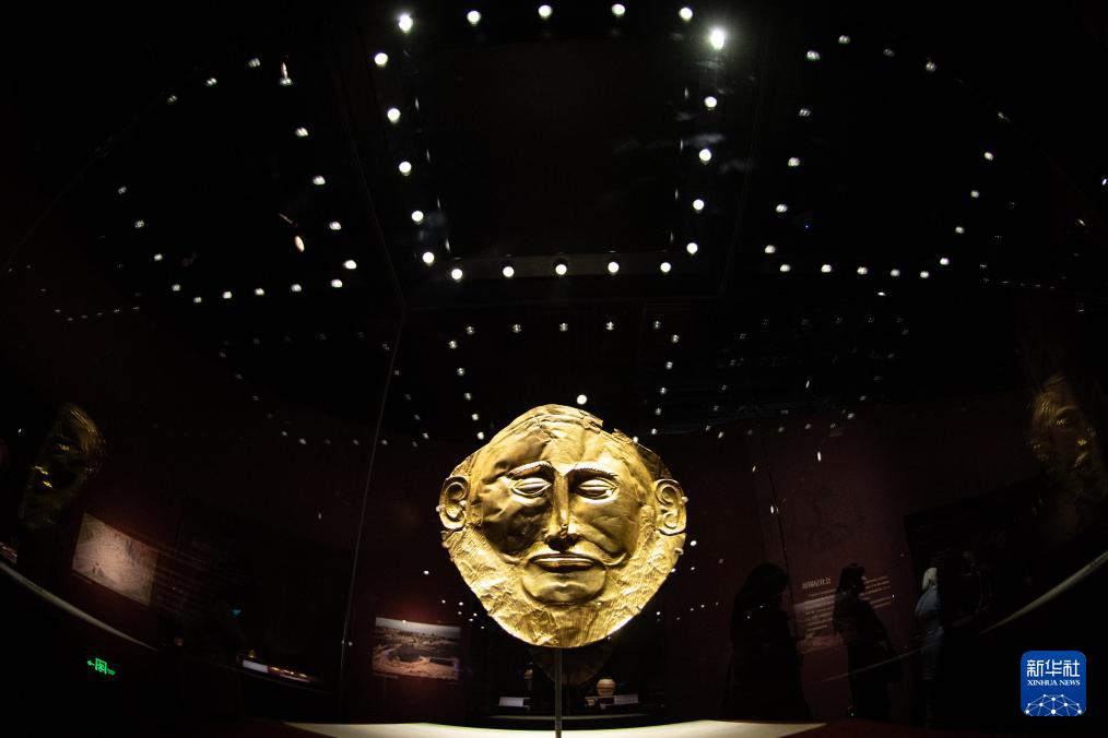 这是11月20日拍摄的展品“阿伽门农金面具”复制品。这件复制品来自希腊迈锡尼考古博物馆,原件收藏于希腊国家考古博物馆。