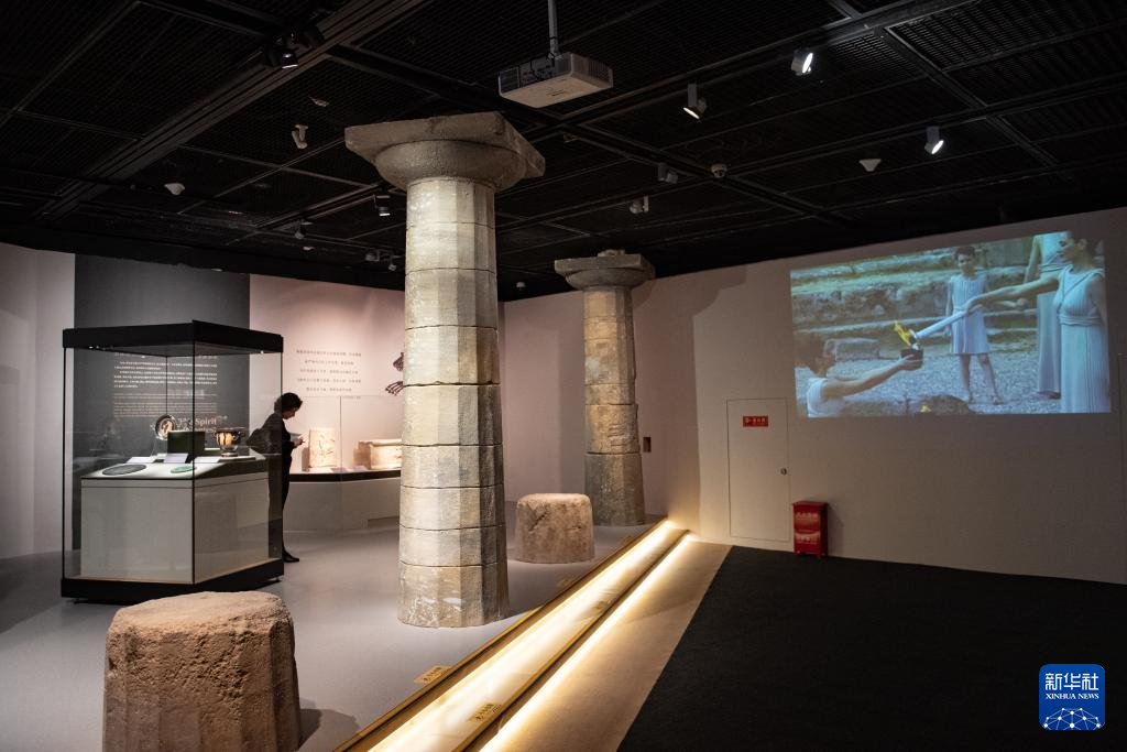 这是11月20日拍摄的“希腊人——从阿伽门农到亚历山大”展厅一角,这里在播放2008年在希腊奥林匹亚举办的北京奥运圣火取火仪式视频。