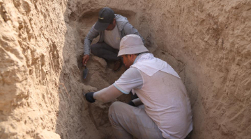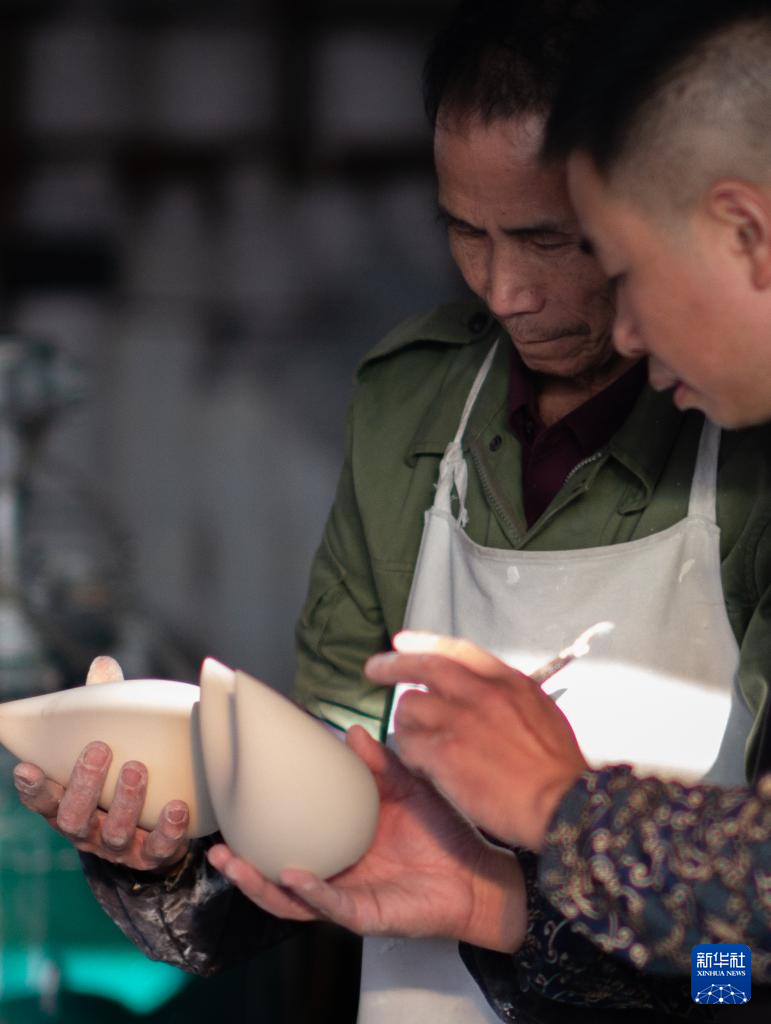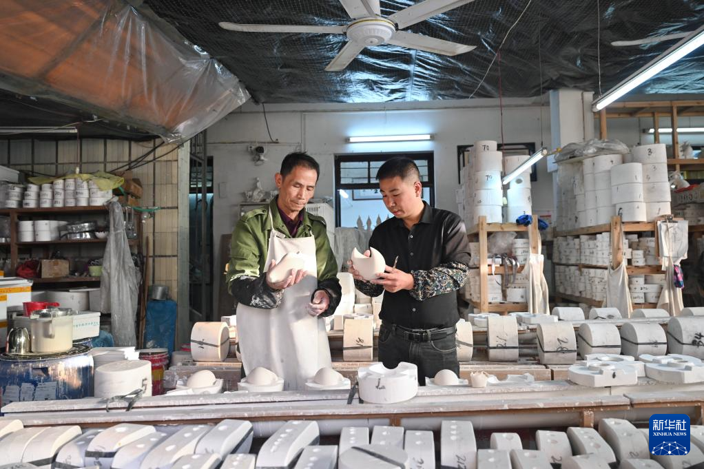 12月6日,彭成雄(右)在位于福建省泉州市德化县的工作室内与父亲一起查看陶瓷坯体。