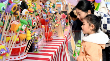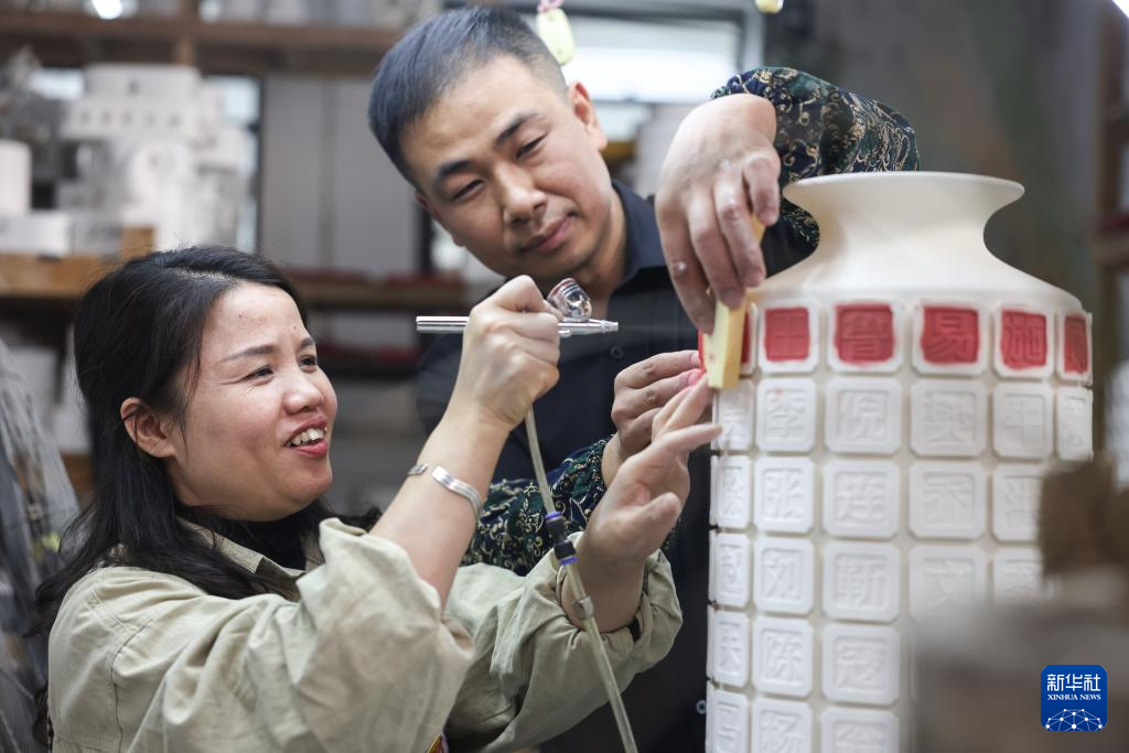 12月6日,彭成雄与妻子郑宝珠在位于福建省泉州市德化县的工作室内为陶瓷作品上色。