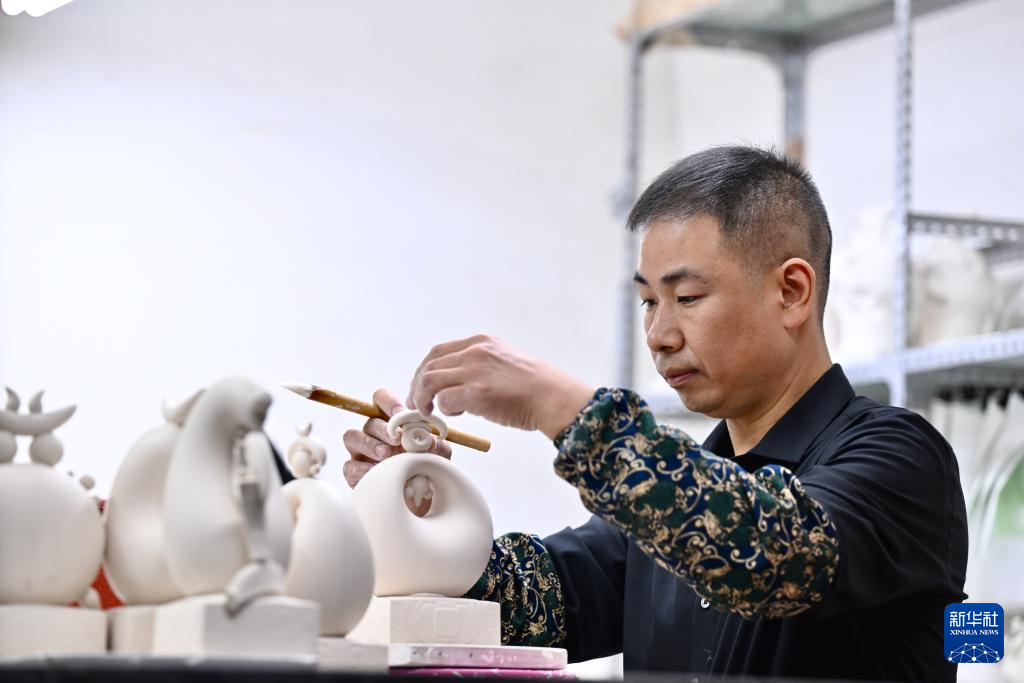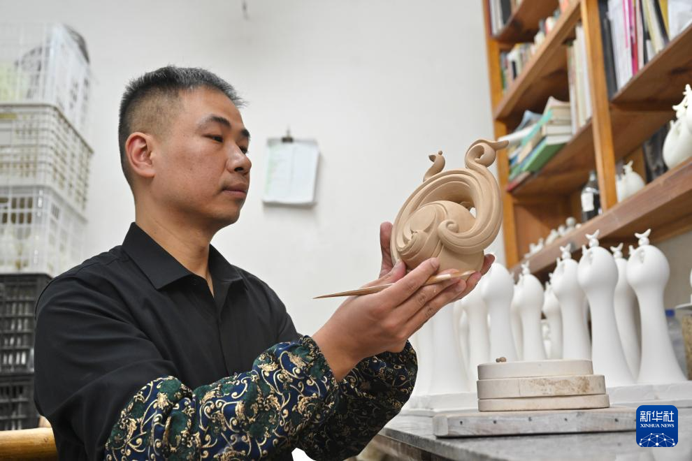 12月6日,彭成雄在位于福建省泉州市德化县的工作室内进行创作。