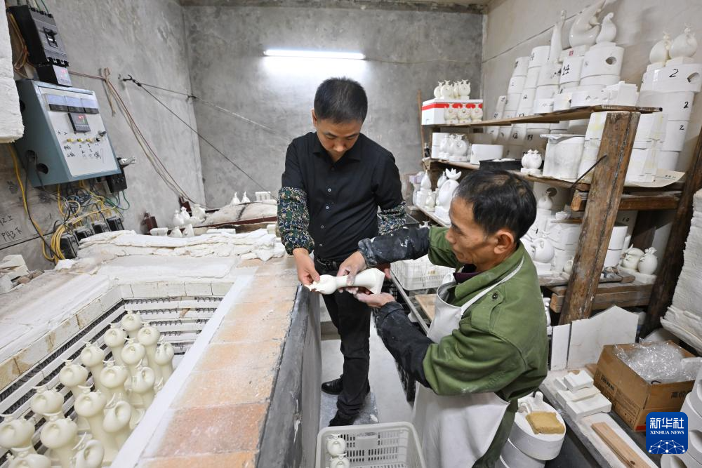 12月6日,彭成雄(左)在位于福建省泉州市德化县的工作室内与父亲一起将烧制好的陶瓷作品出炉。