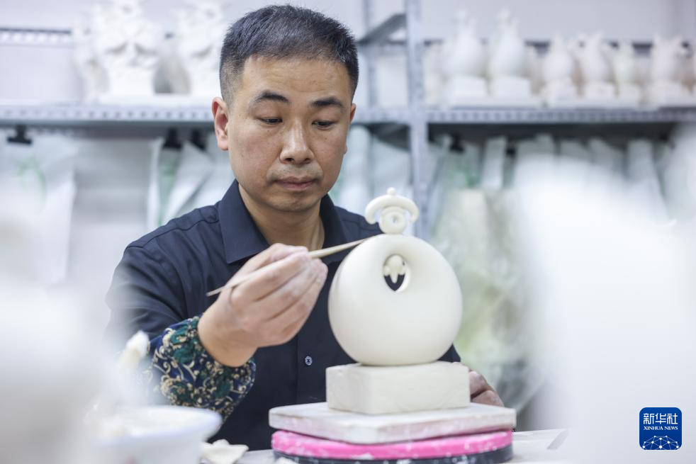 12月6日,彭成雄在位于福建省泉州市德化县的工作室内进行修坯工作。