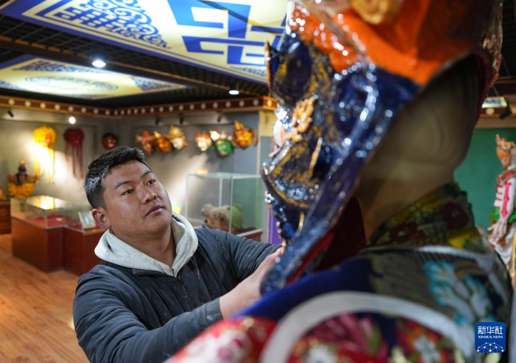 12月9日,西洛在合作社展览厅查看和同事们一起制作的西藏传统面具。