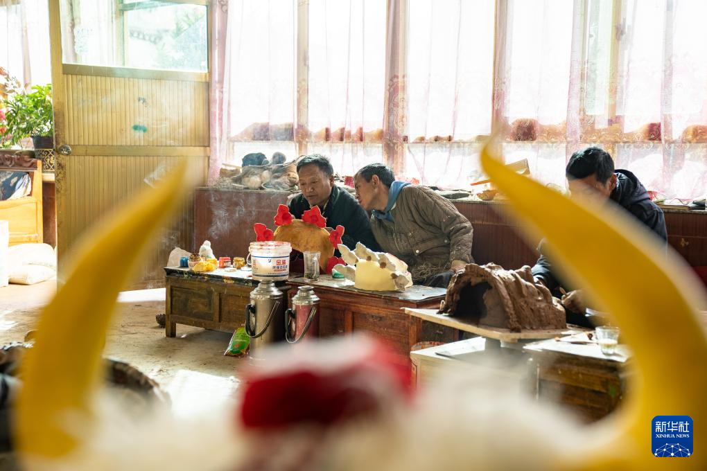 12月9日,西洛(左一)和同事交流西藏传统面具制作心得。
