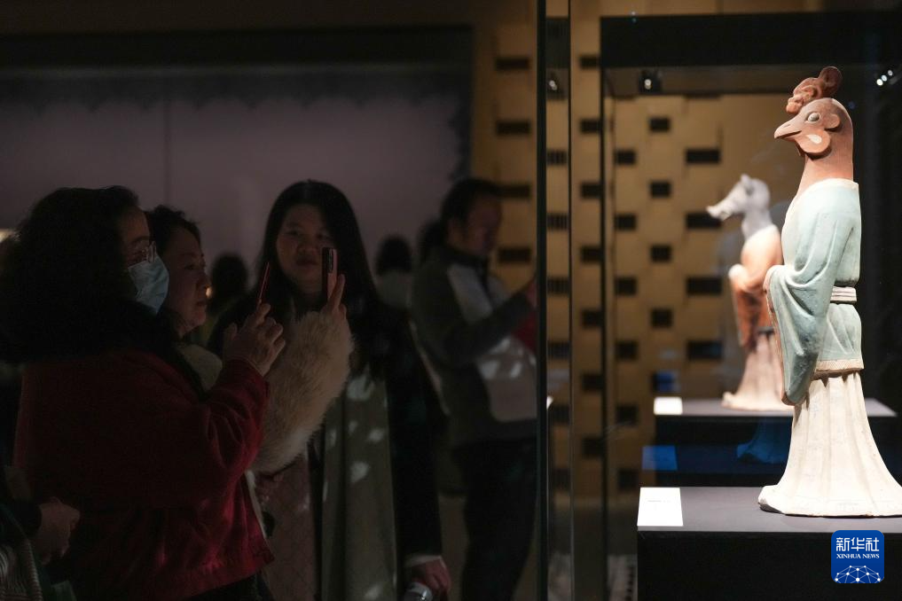 1月21日,观众在“聚宝之盆——新疆文物珍品展”拍摄猪首人身俑(复制品)。