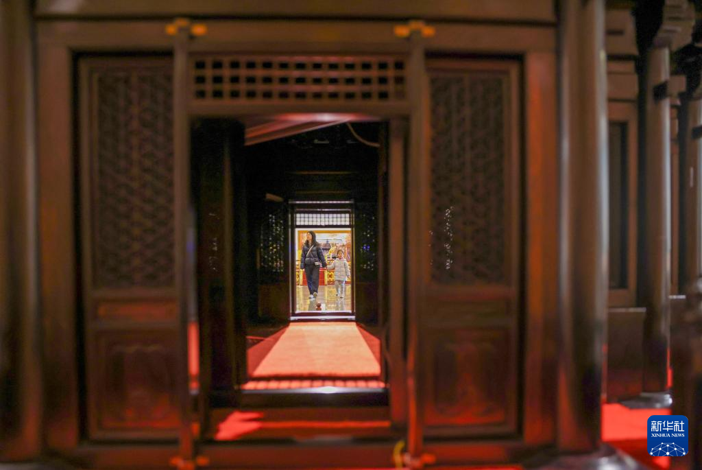 3月15日,游客在中国紫檀博物馆内拍摄古建筑微缩景观。