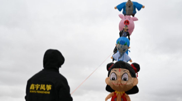 3月24日,府学胡同小学学生向来宾介绍同学们绘制的风筝。