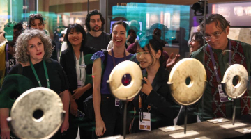 4月28日,观众在青岛电影博物馆农村露天放映场景复原展区参观。
