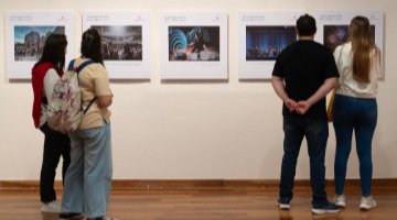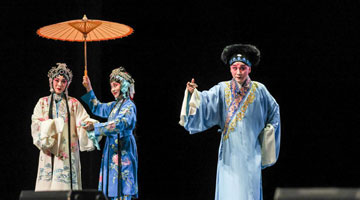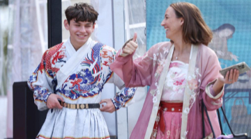 2024年4月30日,在沈阳故宫,来自俄罗斯的芭蕾舞演员与沈阳京剧院的演员互动。