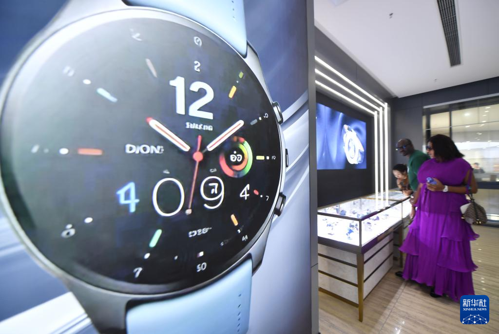 5月17日,两名非洲游客在船山钟表博物馆内的产品展销区参观。