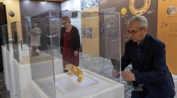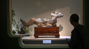 这是展出的清代珐华三彩刻划兽面纹铺首耳琵琶尊(5月19日摄)。