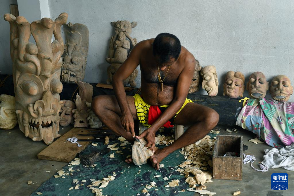6月25日,一名手工艺者在斯里兰卡戈纳波拉村制作斯里兰卡传统面具。