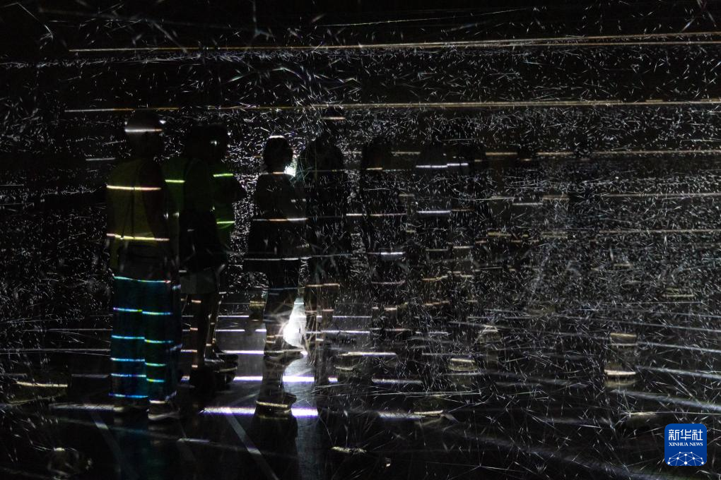 7月4日,在匈牙利佩奇,人们与灯光装置互动。