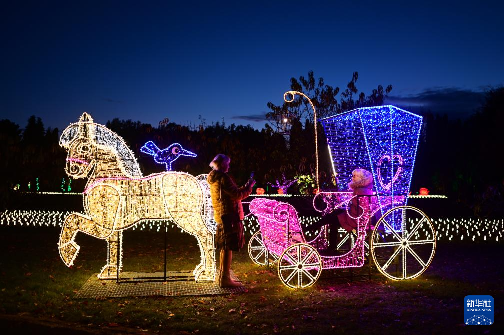 10月25日,在波兰华沙,游客参观波兰科学院植物园举办的“光之花园”灯光展。