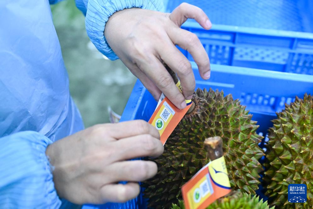 10月17日,在广州白云区一家水果经销商的运营中心,工作人员展示刚到货的榴莲鲜果标签。