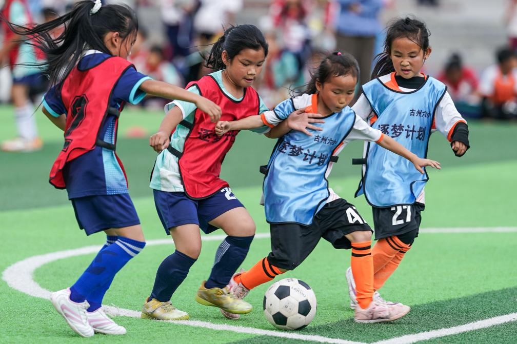 4月25日,在贵州省榕江县古州镇第六小学,学生们在“班超”足球赛中拼抢。2024年以来,榕江全县乡镇及以上中小学陆续开展了借鉴“村超”文体融合模式的“班超”足球赛,这一创举有效保持和增强了“村超”活力。新华社发(王炳真摄)
