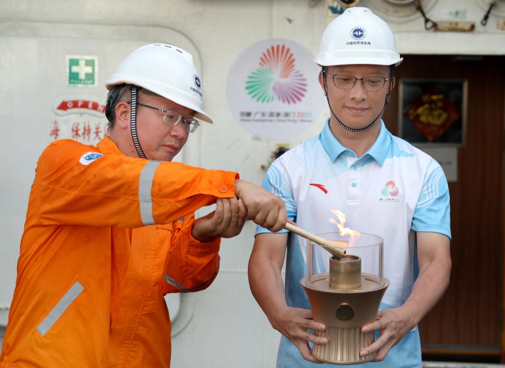在科考船甲板面,“源火”采集组副组长,广州海洋地质调查局副总工程师沙志彬(左)用引火棒将“源火”转移至“源火”盒(9月18日摄)。新华社记者 卢汉欣 摄
