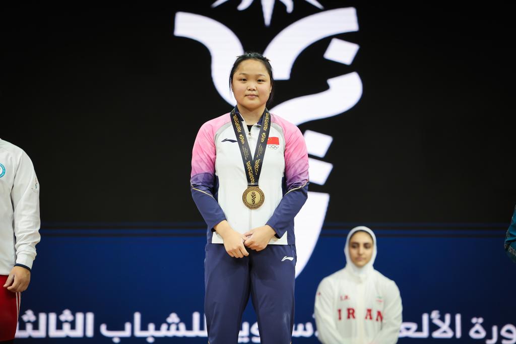 举重赛场上,朱彩云独揽女子63公斤级挺举和抓举两枚金牌,抓举成绩刷新亚洲少年纪录。