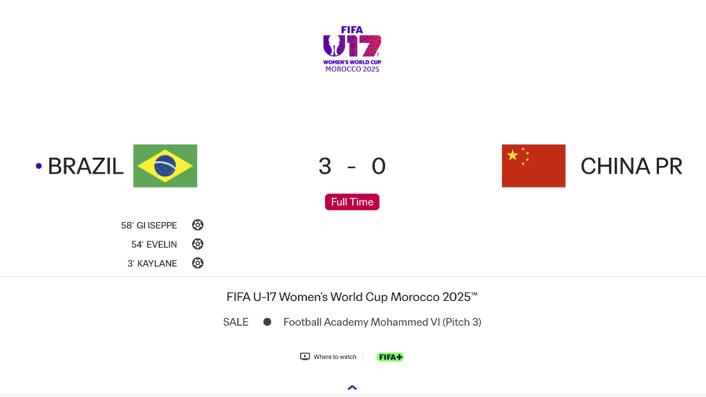 新华社拉巴特10月28日电 在28日进行的2025年U17摩洛哥女足世界杯八分之一决赛中,中国队以0:3负于巴西队,无缘八强。