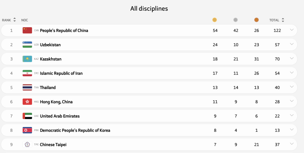中国代表团目前以54金42银26铜高居奖牌榜第一,乌兹别克斯坦和哈萨克斯坦分列第二、三位。