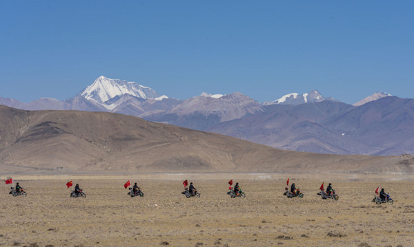 和高原的許多牧民一樣,石覺塔布是個(gè)“騎士”。從前,他騎馬放牧;現(xiàn)在,他騎摩托車守邊。作為昌果邊境派出所摩托車巡邏隊(duì)的隊(duì)長,這天,他要帶隊(duì)進(jìn)行邊境巡防訓(xùn)練。