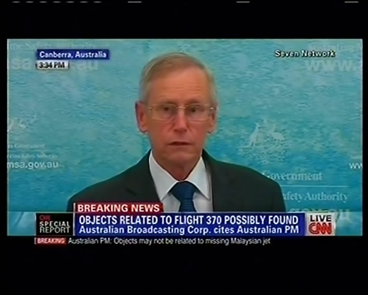 ??? 澳方稱在印度洋中發(fā)現(xiàn)了可能與馬航失聯(lián)客機有關(guān)物體這張3月20日拍攝的CNN視頻截圖顯示,澳大利亞海事安全局官員在堪培拉召開的新聞發(fā)布會上發(fā)言(左圖為相關(guān)搜尋海域的示意圖)。澳大利亞總理阿博特當(dāng)日在議會說,澳方在印度洋中發(fā)現(xiàn)了可能與馬航失聯(lián)客機有關(guān)的兩個物體。澳大利亞海事安全局官員當(dāng)日說,發(fā)現(xiàn)可疑碎片的位置與之前確定的馬航失聯(lián)客機南部搜尋航道高度吻合,但當(dāng)?shù)睾S蛩沫h(huán)境非常差。新華社發(fā)
