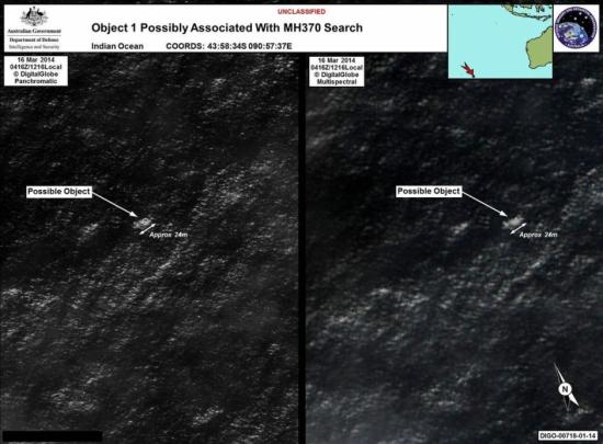澳大利亞海事安全局20日在“推特”上公布了發現疑似與馬航失聯客機有關的物體的衛星圖像。在圖像中,澳方標明,其中一件物體長約24米,另一件長約5米。衛星是在3月16日抓取的這一圖像。圖片來源:澳大利亞海事安全局