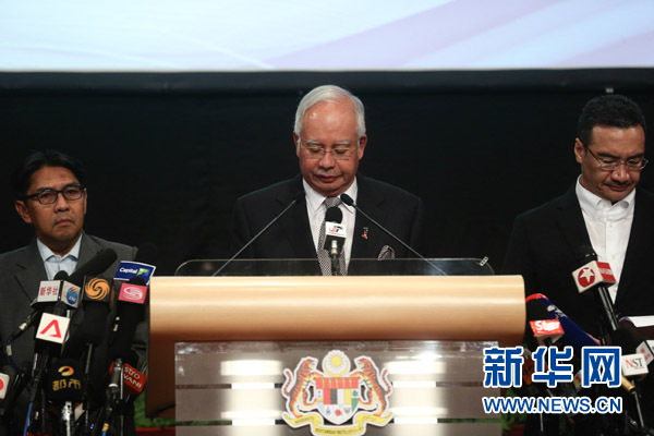3月24日,在馬來西亞吉隆坡,馬來西亞總理納吉布(中)就馬航失聯航班舉行記者會。馬來西亞總理納吉布當日在吉隆坡宣布,根據最新信息,馬航失聯航班MH370在南印度洋墜毀。 新華社記者 王申 攝