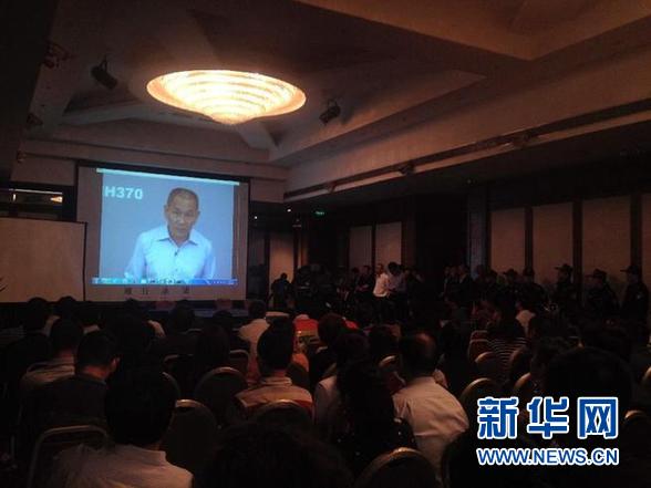 5月1日,在北京麗都維景酒店,乘客家屬在收看馬來西亞航空公司首席執行官葉海亞發表聲明的視頻連線。 新華社記者 沈伯韓 攝