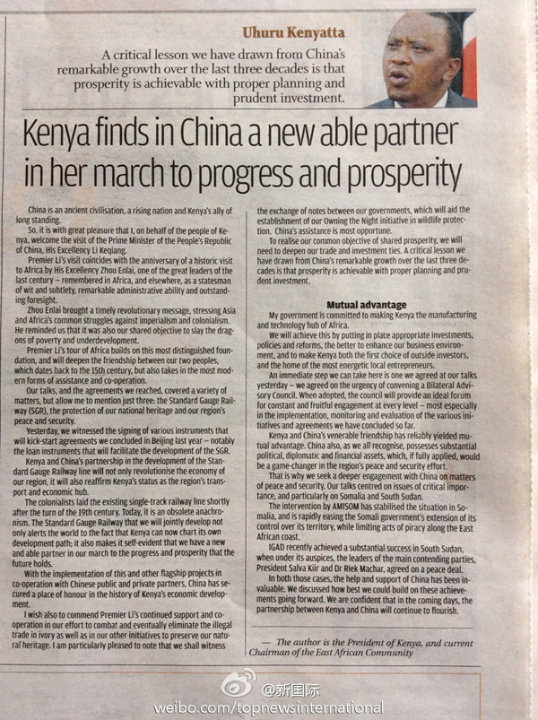 ????新華網(wǎng)北京5月11日電? 據(jù)新華社“新國際”微博報道,肯尼亞《旗幟報》11日發(fā)表肯雅塔總統(tǒng)署名文章《肯將中國視為發(fā)展繁榮進(jìn)程中的強力伙伴》。文章稱,李克強此訪將進(jìn)一步加深傳統(tǒng)友誼,推動雙方新時期合作。隨著多領(lǐng)域的良好合作,中國在肯經(jīng)濟社會發(fā)展中重要性與日俱增。肯方對肯中關(guān)系未來充滿信心。